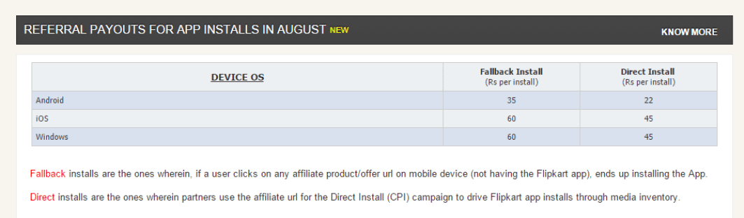 Flipkart affiliate is the Reward program from flipkart in which flipkart is giving money to the affiliates.When you promote flipkart on your network then flipkart will give you commission per lead. Best way to earn from flipkart affiliate program is to promote flipkart mobile app.Just refer your friends to download flipkart app and you can earn up to Rs 60 per successful referral(As You Can See In Image Below).There are so many other app referral campaigns by which you can earn money,to learn more about those campaigns visit following links.